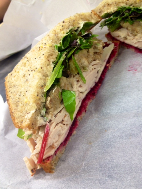 The chicken salad sandwich is my favorite from their menu, although the California turkey is a very close second. The chicken salad is tasty with pecans, cranberries and delicately shredded chicken. They don’t go overboard with the mayo, so it isn’t dripping and stays well on the seeded bread. The most interesting part of the sandwich is that it isn’t just chicken salad. They add Havarti cheese, arugula, tomato and mustard. I would have never thought to put cheese and mustard on a chicken salad sandwich, but it definitely makes the sandwich different and delicious.