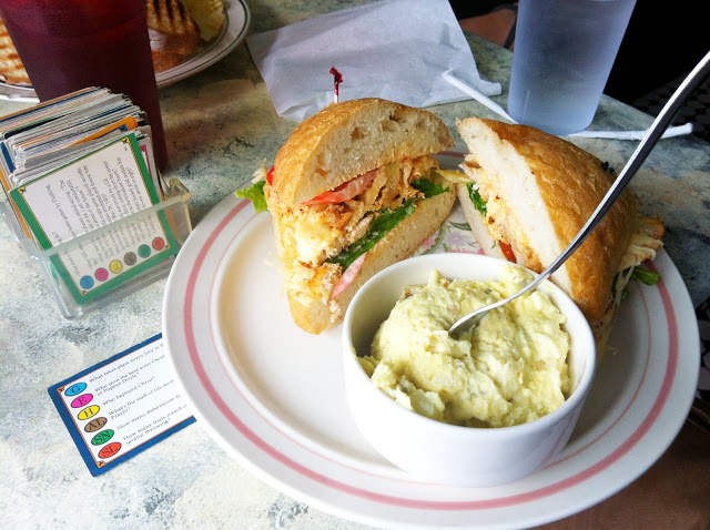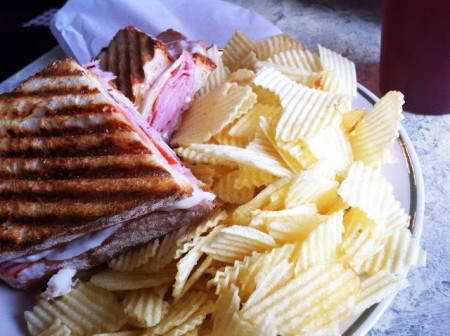 I went for the chicken sandwich along with potato salad as my side. With my sweet tooth, I couldn’t pass up the peanut butter chocolate chip cookie that was the size of a Frisbee. My wife ordered the Italian Panini made with ham, pepperoni and provolone cheese on grilled sour dough bread.
