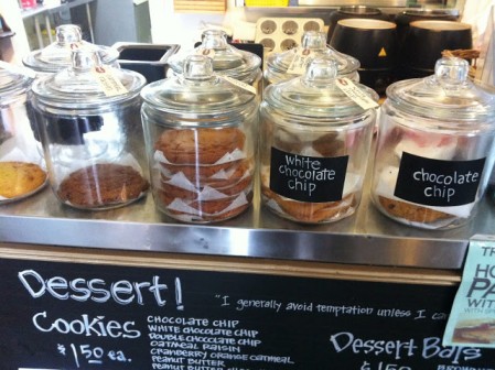 Near the register is a blackboard with the different kinds of sandwiches along with seven or eight cookie jars with oversized cookies. Even though the blackboard touts that everything is good, I asked the lady behind the counter her suggestions. “I would order either the Turkey Club or the Chicken Chipotle Parmesan.”